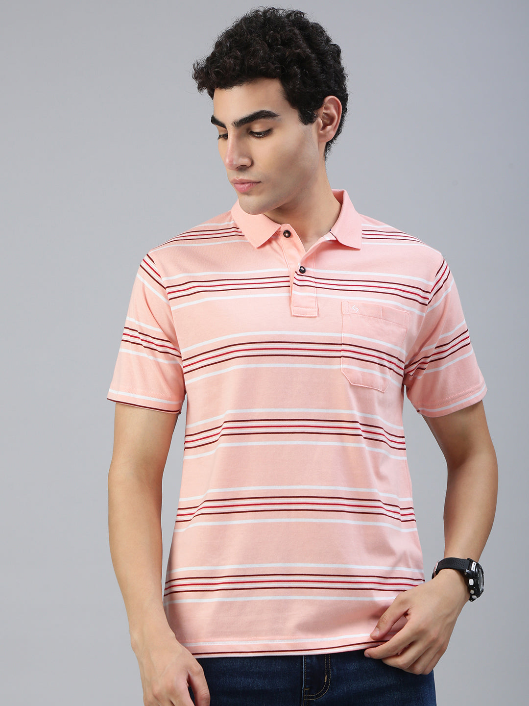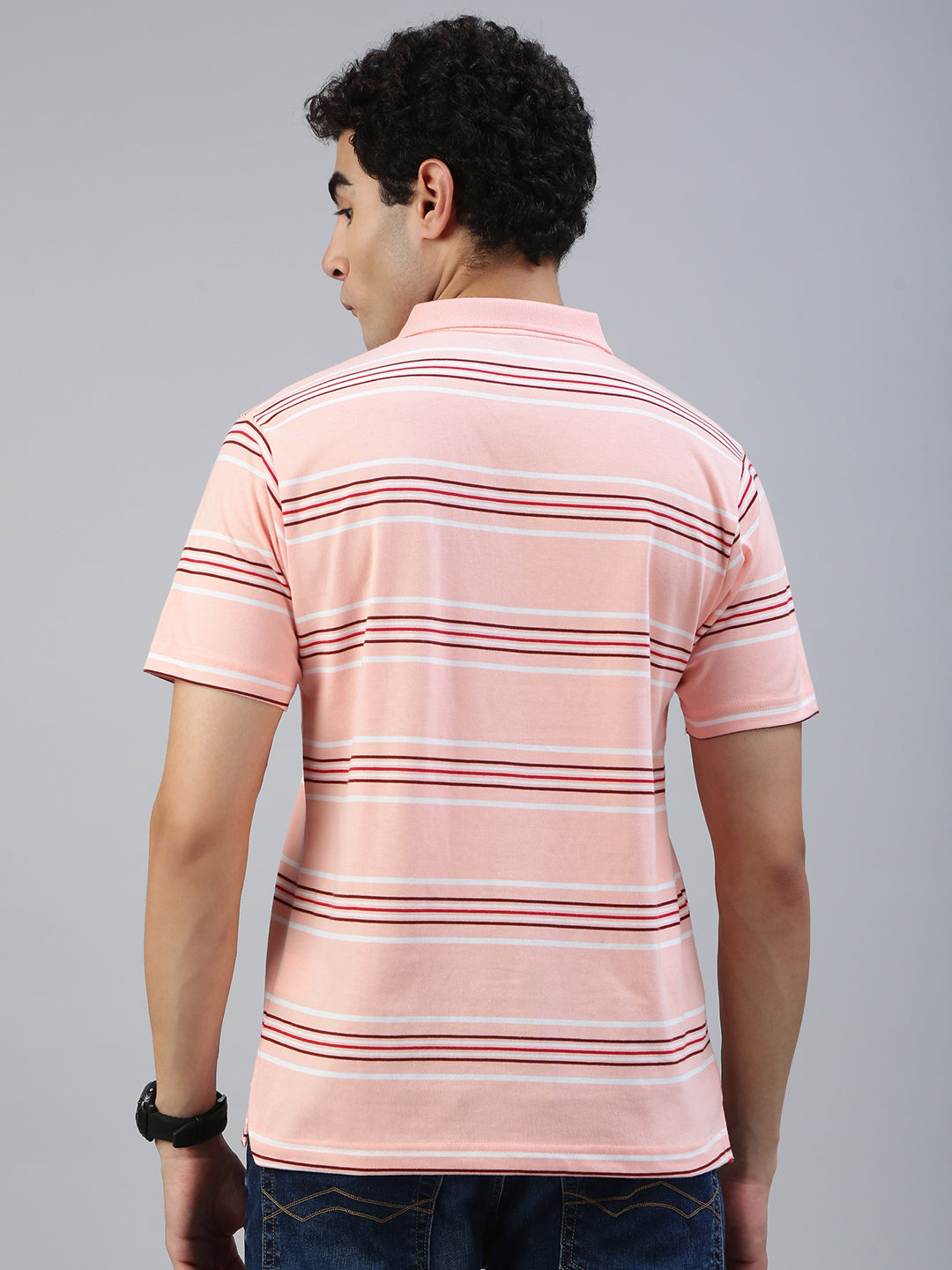 Classic Polo Men's Half Sleeve Peach/White Polo Neck Authentic Fit Striped T-Shirt||AVON - 608 A AF P