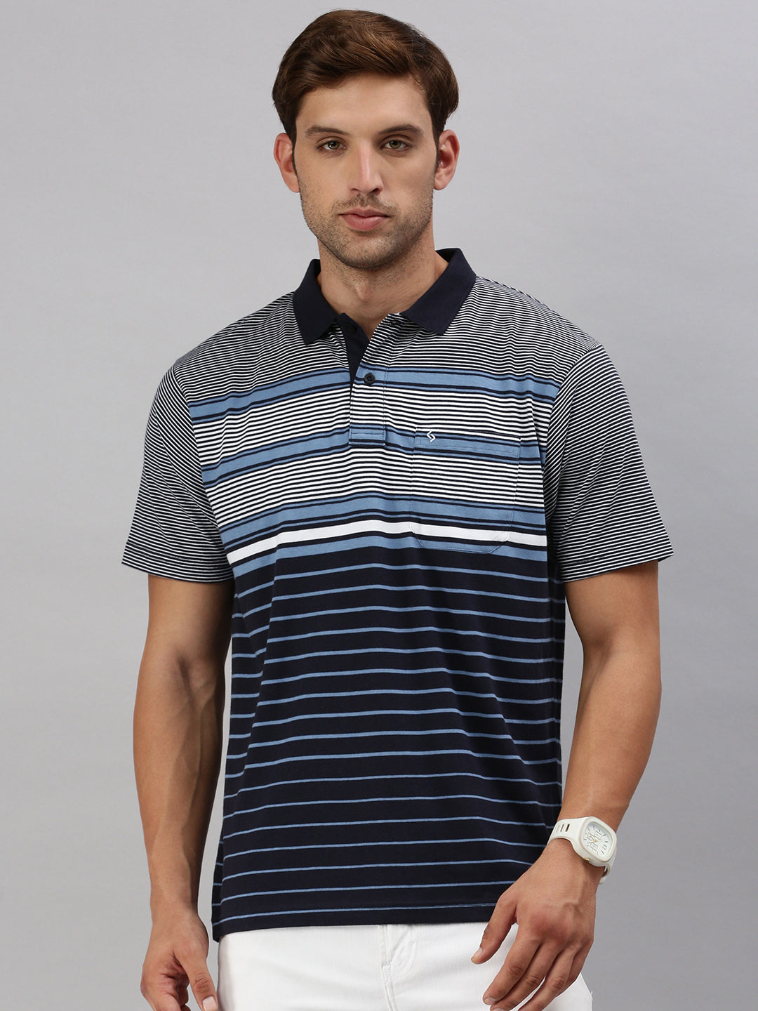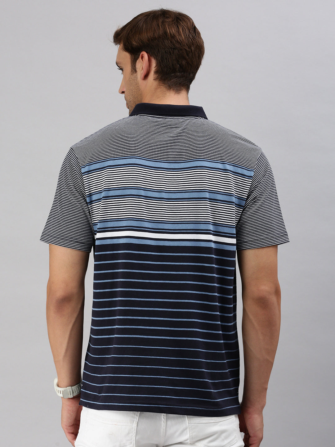 Classic Polo Men's Half Sleeve Navy Blue/White Polo Neck Authentic Fit Striped T-Shirt | AVON - 591 A AF P