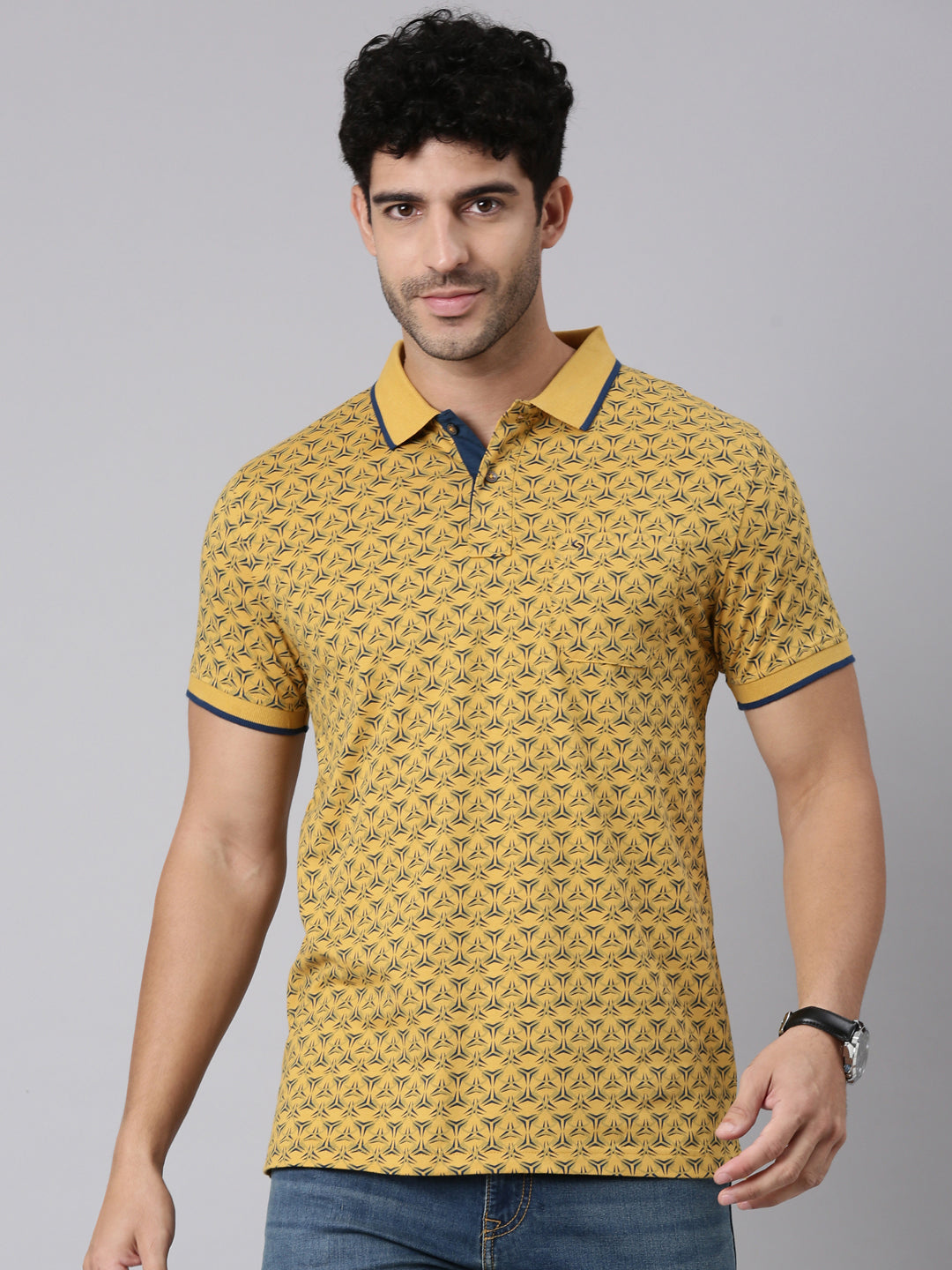 Classic Polo Men's Half Sleeve Yellow/Blue Polo Neck Slim Fit All-Over Print Cotton T-Shirt | BELLO - 394 A SF P