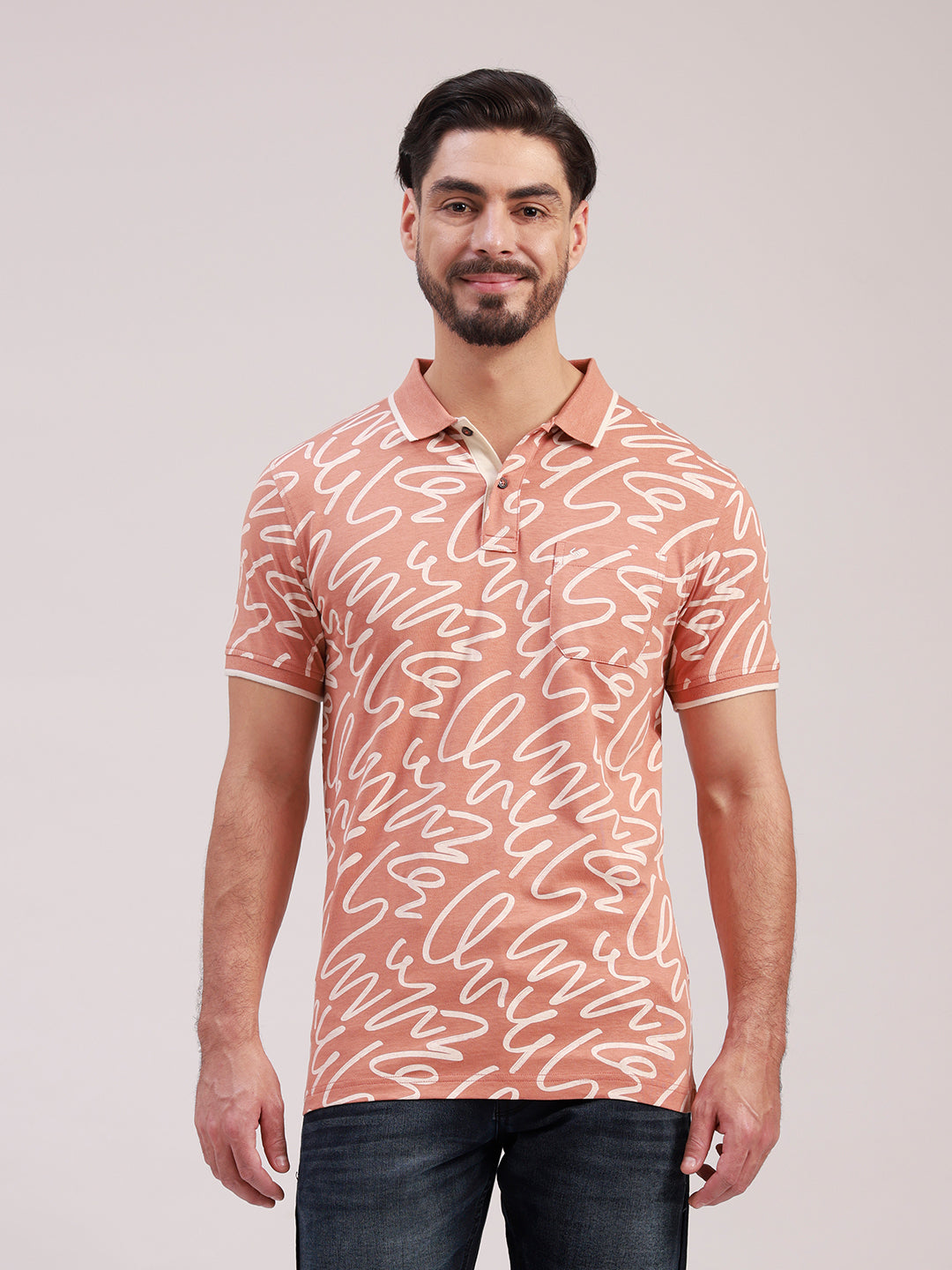 Classic Polo Men's Half Sleeve Peach/White Polo Neck Slim Fit All-Over Print Cotton T-Shirt | LTS-AOP - 120 B SF P