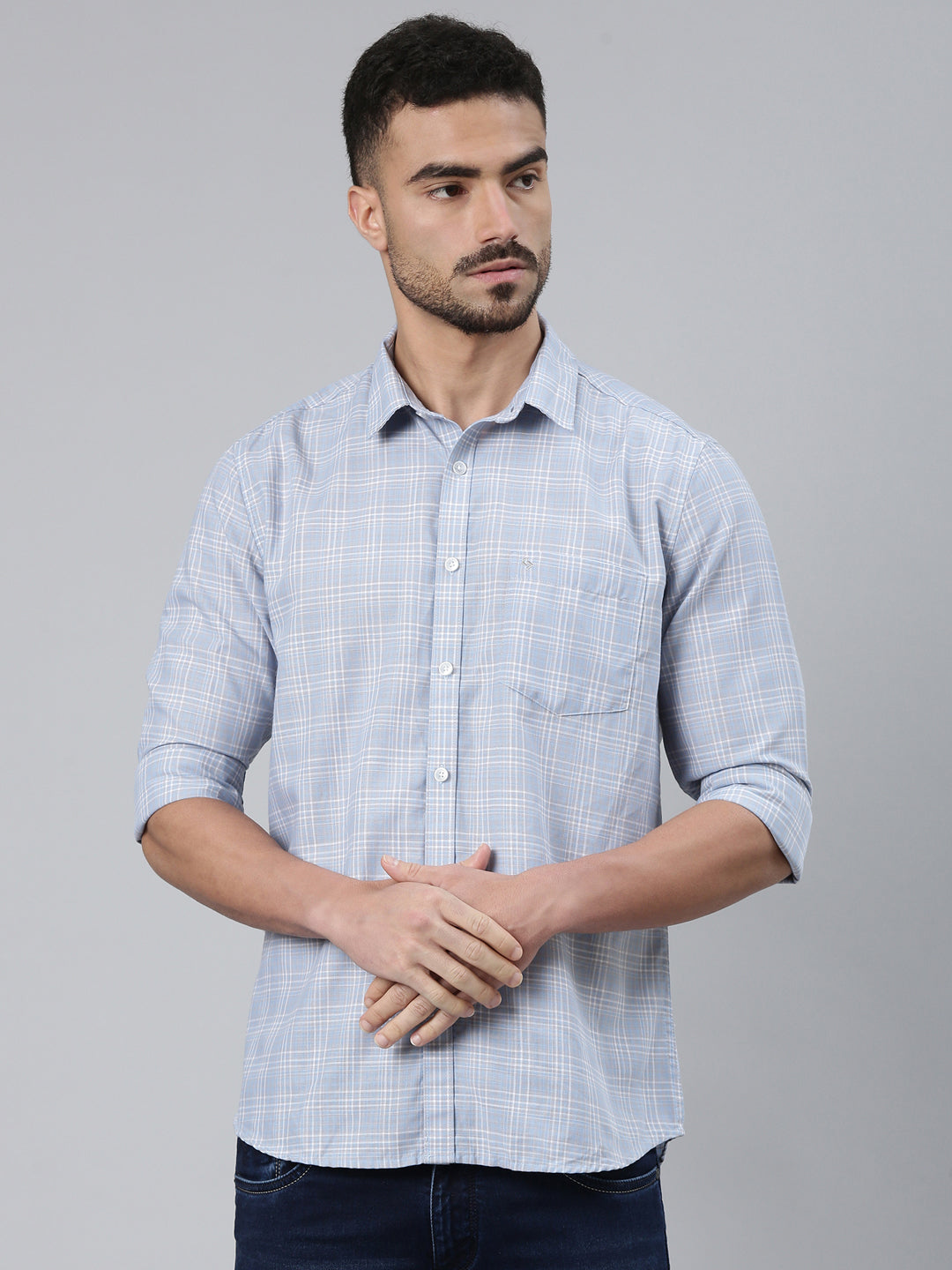 Classic Polo Men's Light Blue/White Polo Neck Checked Cotton Slim Fit Woven Shirt | SQ2-EL-61 B-FS-CHK-SF
